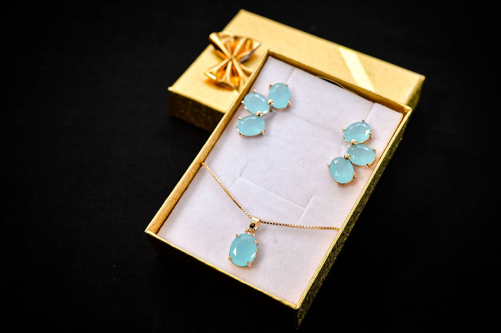 CONJUNTO PONTO DE LUZ- CRISTAL AZUL LEITOSO E ZIRCÔNIAS